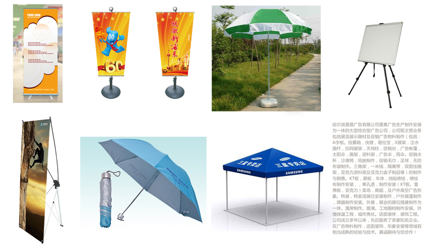 • 主營:A字板。投票箱,快展,易拉寶,X展架,注水旗桿,拉網(wǎng)展架,天地柱,促銷臺(tái),廣告帳篷,太陽傘,畫架,資料架,廣告?zhèn)?,雨傘。促銷水杯,沙灘椅,紙抽制作,促銷毛巾,足球,無紡布袋制作。三角架,一米線,隔離帶,雙面掛畫架,亞克力資料架及亞克力盒子制品等