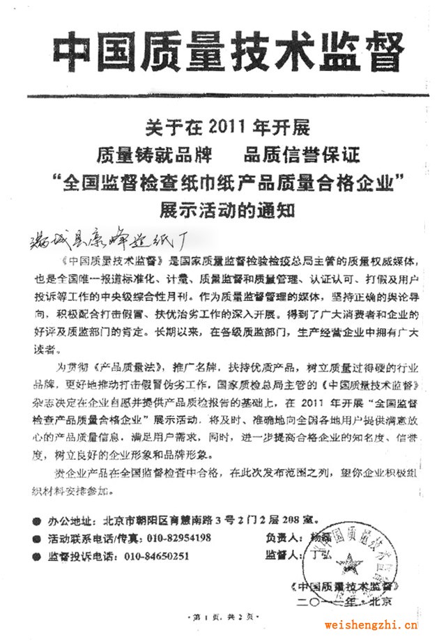 中國質量技術監(jiān)督關于2011年開展質量“全國監(jiān)督檢查紙巾產品質量合格企業(yè)”展示活動的通知