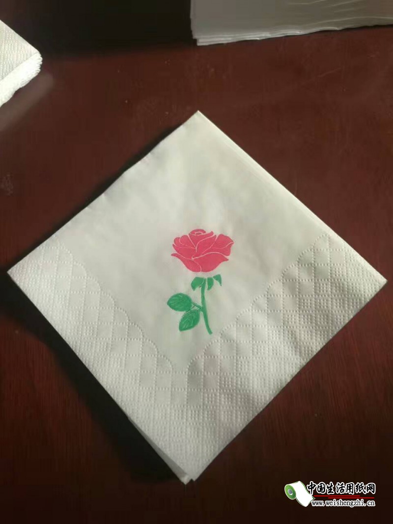 圖片中的餐巾紙上有一朵漂亮的花,花上有兩種顏色,這種是由于餐巾紙機(jī)器上具有彩印功能。要想在餐巾紙上達(dá)到兩種顏色的彩色印刷,餐巾紙機(jī)器就必須要具備兩色印刷的裝置,這個(gè)裝置可以用也可以不用,不用的時(shí)候做出來的餐巾紙就是沒有彩印的餐巾紙。