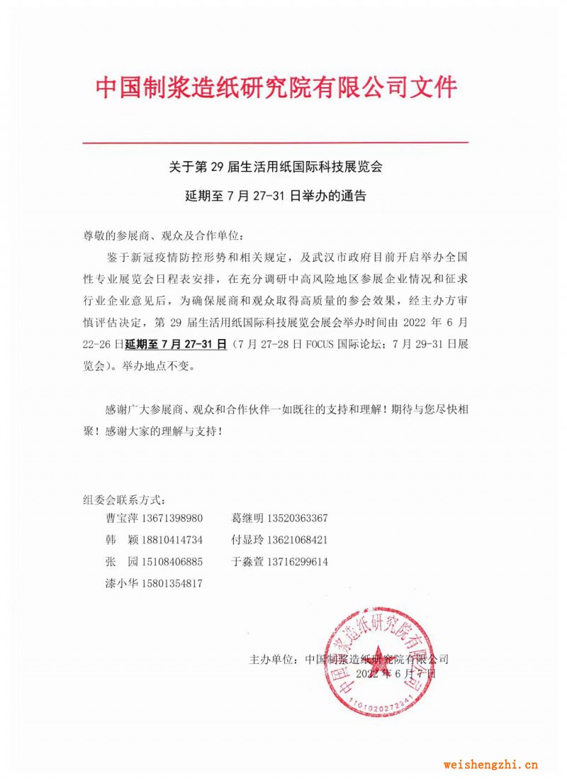 第29屆生活用紙國際科技展覽會展會舉辦時間由2022年6月22-26日延期至7月27-31日