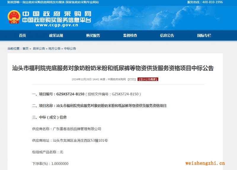 汕頭市福利院兜底服務(wù)對(duì)象奶粉奶米粉和紙尿褲等物資供貨服務(wù)資格項(xiàng)目中標(biāo)公告