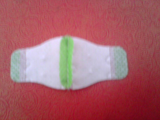 閑話不多說切入正題,把兩片魔術(shù)粘正面相對,調(diào)節(jié)整齊,順著綠色邊界縫合起來。為了拍照清楚,我用的黑色線:
