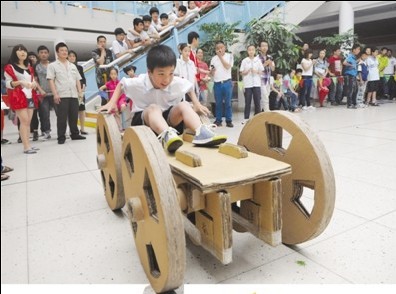 核心提示:溫州第四屆載人紙車的制作比賽 ,廢舊紙箱變載人紙車。