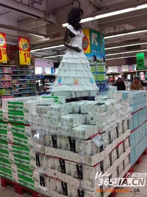 合肥家樂(lè)福超市:衛(wèi)生紙裹成婚紗攬客