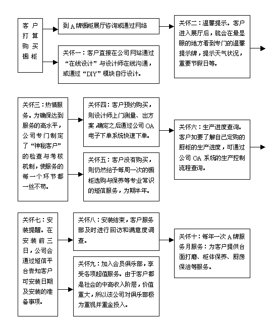 正常情況下,品牌傳播始于第一個W,即通過廣告宣傳讓消費者記住品牌名稱和訴求。而當企業(yè)的廣告投入連年增加,但業(yè)績卻不會增加時,就必須及時轉(zhuǎn)變傳播思路,朝產(chǎn)品差異化和服務(wù)差異化等方面努力!前文提到的雪津啤酒是產(chǎn)品差異化傳播的優(yōu)秀典型。而在品牌傳播的第三個W上,除了海爾的五星級服務(wù),也不乏優(yōu)秀的企業(yè)。如萬科地產(chǎn),其創(chuàng)建的“萬科會”(萬科地產(chǎn)會員俱樂部),培育了老客戶的忠誠度,為其新樓盤貢獻30%左右的業(yè)績。而國內(nèi)某知名櫥柜品牌,更是憑著“客戶關(guān)懷”這一絕招,在征戰(zhàn)全國市場過程中屢建戰(zhàn)功。以下是該品牌“客戶關(guān)懷”系統(tǒng):