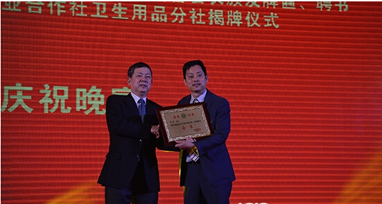 圖為爹地寶貝董事長林斌(右)接任福建首屆衛(wèi)生用品協(xié)會會長