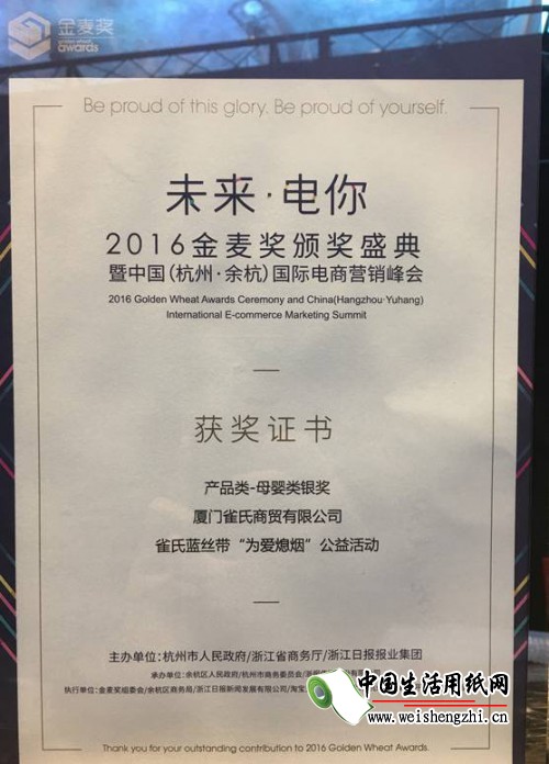 2016年年底,2016金麥獎(jiǎng)?lì)C獎(jiǎng)盛典暨中國(guó)(杭州·余杭)國(guó)際電商營(yíng)銷(xiāo)峰會(huì)盛典在杭州舉行。本次活動(dòng)以“未來(lái)·電你”為核心主題,從電商營(yíng)銷(xiāo)、品牌、數(shù)據(jù)以及跨界創(chuàng)新等多角度解讀“互聯(lián)網(wǎng)+”時(shí)代戰(zhàn)略,呈現(xiàn)了一場(chǎng)電商佼佼者間的PK。雀氏在此次巔峰盛宴中憑借“藍(lán)絲帶·為愛(ài)熄煙”斬獲“2016金麥獎(jiǎng)母嬰產(chǎn)品類(lèi)銀獎(jiǎng)”。