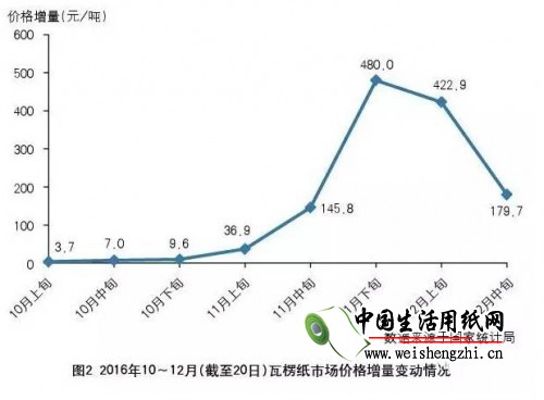 圖2清晰地描繪了2016年10~12月(截至20日)瓦楞紙市場價格增量變動情況。從中可以看出,瓦楞紙的市場價格增量呈現(xiàn)先上升后下降的趨勢,11月瓦楞紙市場價格累計上漲663.4元/噸,上中下旬的價格增量分別為36.9元/噸、145.8元/噸、480.0元/噸;12月(截至20日)瓦楞紙市場價格累計上漲602.6元/噸,價格高達3848.6元/噸,每噸價格比10月底高出了近1300元,上中旬的價格增量分別為422.9元/噸、179.7元/噸。其中,11月下旬增長多,達480.0元/噸,且11月下旬到12月上旬的累計增長超過900元/噸。進入12月后,瓦楞紙市場價格增速開始逐漸