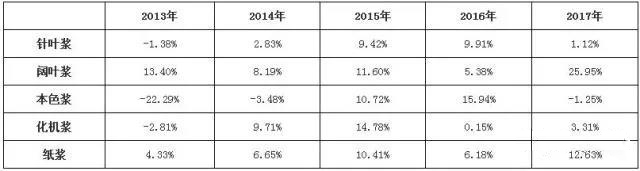 表中可以看出,木漿進(jìn)口量持續(xù)增加,增加的量主要來自闊葉漿,2017年闊葉漿進(jìn)口量同比增幅25.95%,創(chuàng)近5年新高。
