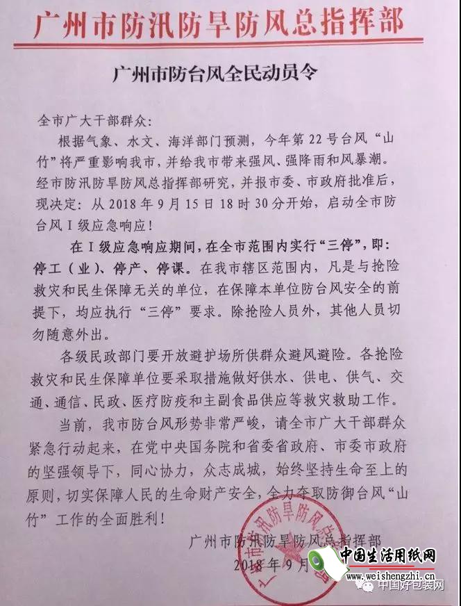 廣州市人民政府決定從2018年9月15日18時30分開始,啟動全市防臺風I級應(yīng)急響應(yīng),除醫(yī)院、供水、供電、供氣、電信等特殊行業(yè),在全市范圍內(nèi)實行“三停”,即:停工(業(yè))、停產(chǎn)、停課。請廣大市民群眾提前做好防范,正確防災(zāi)避險。