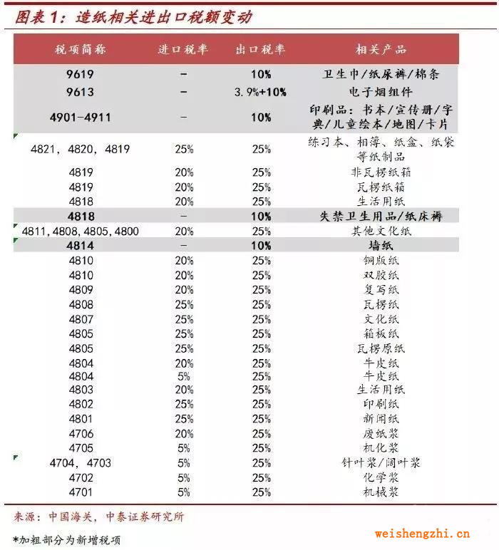 1、此次加征關(guān)稅的3000億美元商品中,輕工造紙相關(guān)條目主要為96、49以及48除上次加征部分以外的剩余項(xiàng)目,相關(guān)產(chǎn)品有印刷品(如書(shū)本、繪本等)、衛(wèi)生用品(如衛(wèi)生巾、紙尿褲)等成品紙類加工品,為下游附加產(chǎn)品。此次加征后,中國(guó)對(duì)美國(guó)出口的紙品及漿類產(chǎn)品關(guān)稅全面提升,中國(guó)尚未出臺(tái)反制稅目。依據(jù)下列分析框架,加征關(guān)稅對(duì)輕工造紙板塊出口影響不大。