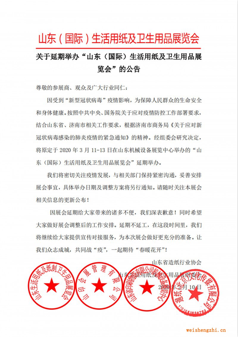 關(guān)于“2020山東生活用紙展延期舉辦”的通告