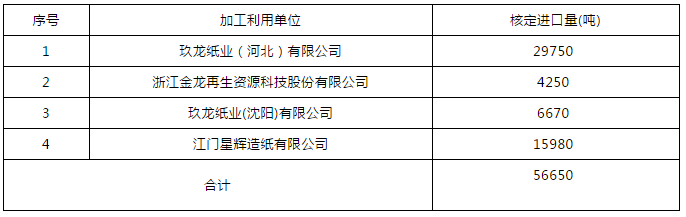 核心提示: 7月24日,環(huán)保部固體廢物與化學(xué)品管理技術(shù)中心公示了2020年第10批限制進(jìn)口類產(chǎn)品明細(xì),共有玖龍紙業(yè)(河北)有限公司、浙江金龍?jiān)偕Y源科技股份有限公司、玖龍紙業(yè)(沈陽(yáng))有限公司和江門星輝造紙有限公司4家造紙企