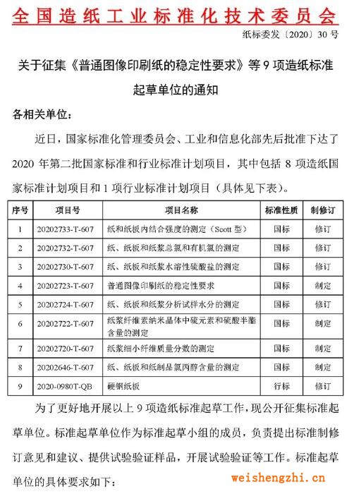 關(guān)于征集《普通圖像印刷紙的穩(wěn)定性要求》等9項造紙標(biāo)準起草單位的通知