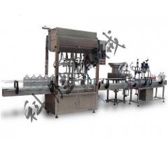 旋轉(zhuǎn)式灌裝機(jī) + 送瓶輸送帶 + TRJ-901CR立式貼標(biāo)機(jī) + XG2004自動旋蓋機(jī) + 送瓶機(jī)