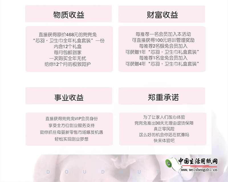 每推薦一名會員加入本活動可直接獲得100元培訓管理獎勵;每推薦2名銀兔會員加入可獲贈1年“芯羽·衛(wèi)生巾禮盒套裝”,每推薦1名金兔會員加入可獲贈4年“芯羽·衛(wèi)生巾禮盒套裝”。